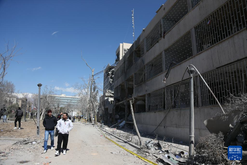 3月3日,人們走過(guò)伊朗德黑蘭一處在襲擊中受損的建筑。
