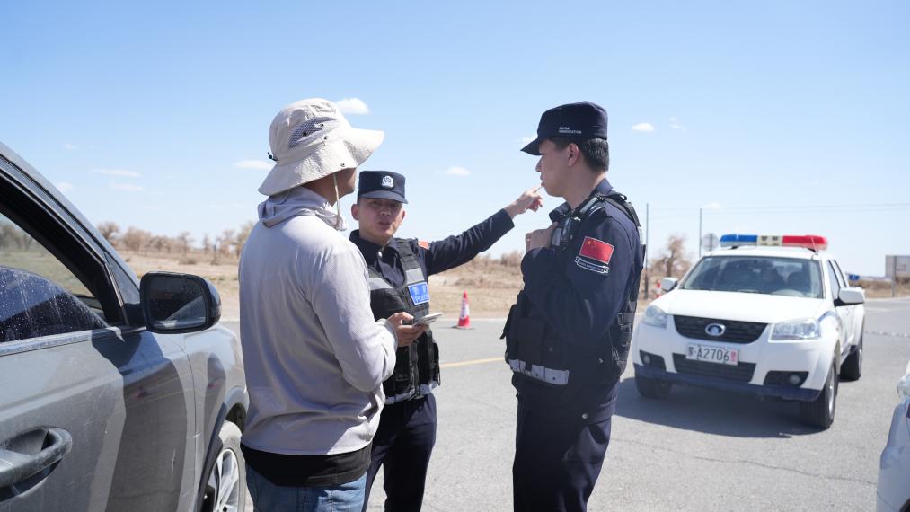 阿拉善邊境管理支隊(duì)民警在發(fā)射場外圍疏散來往車輛。
