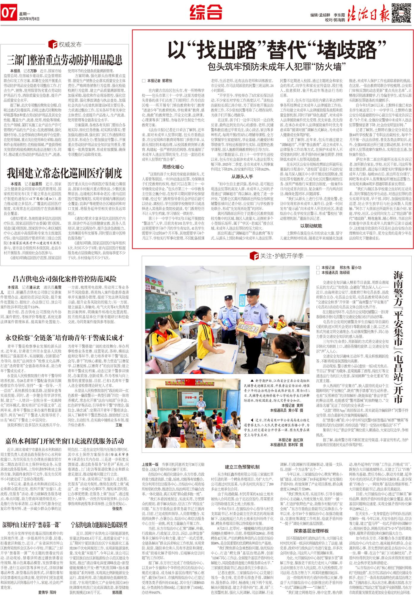 2025年9月8日,《法治日報(bào)》第7版整版刊發(fā)題為《以“找出路”替代“堵歧路” 包頭筑牢預(yù)防未成年人犯罪“防火墻”》的文章,報(bào)道了近年來,面對未成年人犯罪問題,包頭市委政法委、市公安局和市教育局等部門多措并舉,從源頭預(yù)防到末端治理,從校園教育到矯正教育,構(gòu)建起一張嚴(yán)密的防范網(wǎng)絡(luò),有效遏制了未成年人違法犯罪的發(fā)生,打出一套防范未成年人犯罪的“組合拳”。