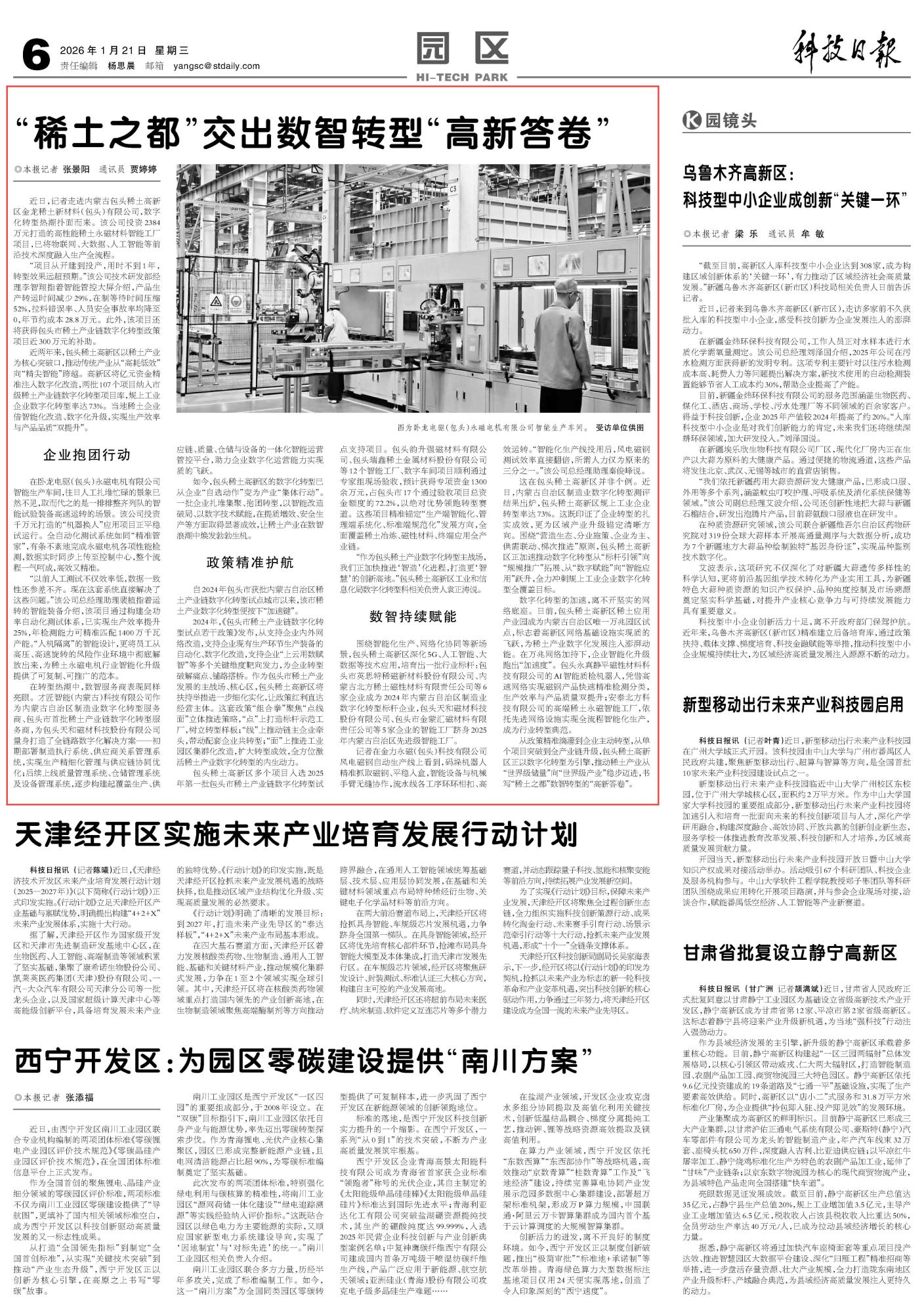 2026年1月21日《科技日報(bào)》第6版刊發(fā)了《“稀土之都”交出數(shù)智轉(zhuǎn)型“高新答卷”》的文章,報(bào)道了從政策精準(zhǔn)滴灌到企業(yè)主動(dòng)轉(zhuǎn)型,從單個(gè)項(xiàng)目突破到全產(chǎn)業(yè)鏈升級,包頭稀土高新區(qū)正以數(shù)字化轉(zhuǎn)型為引擎,推動(dòng)稀土產(chǎn)業(yè)從“世界級儲(chǔ)量”向“世界級產(chǎn)業(yè)”穩(wěn)步邁進(jìn),書寫“稀土之都”數(shù)智轉(zhuǎn)型的“高新答卷”。
