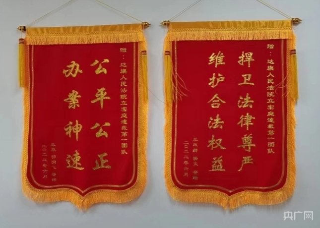 “公平公正、辦案神速”“捍衛(wèi)法律尊嚴(yán)、維護(hù)合法權(quán)益”,在立案庭速裁第一團(tuán)隊(duì)員額法官陳軍的辦公室,兩面錦旗并列掛在墻上。