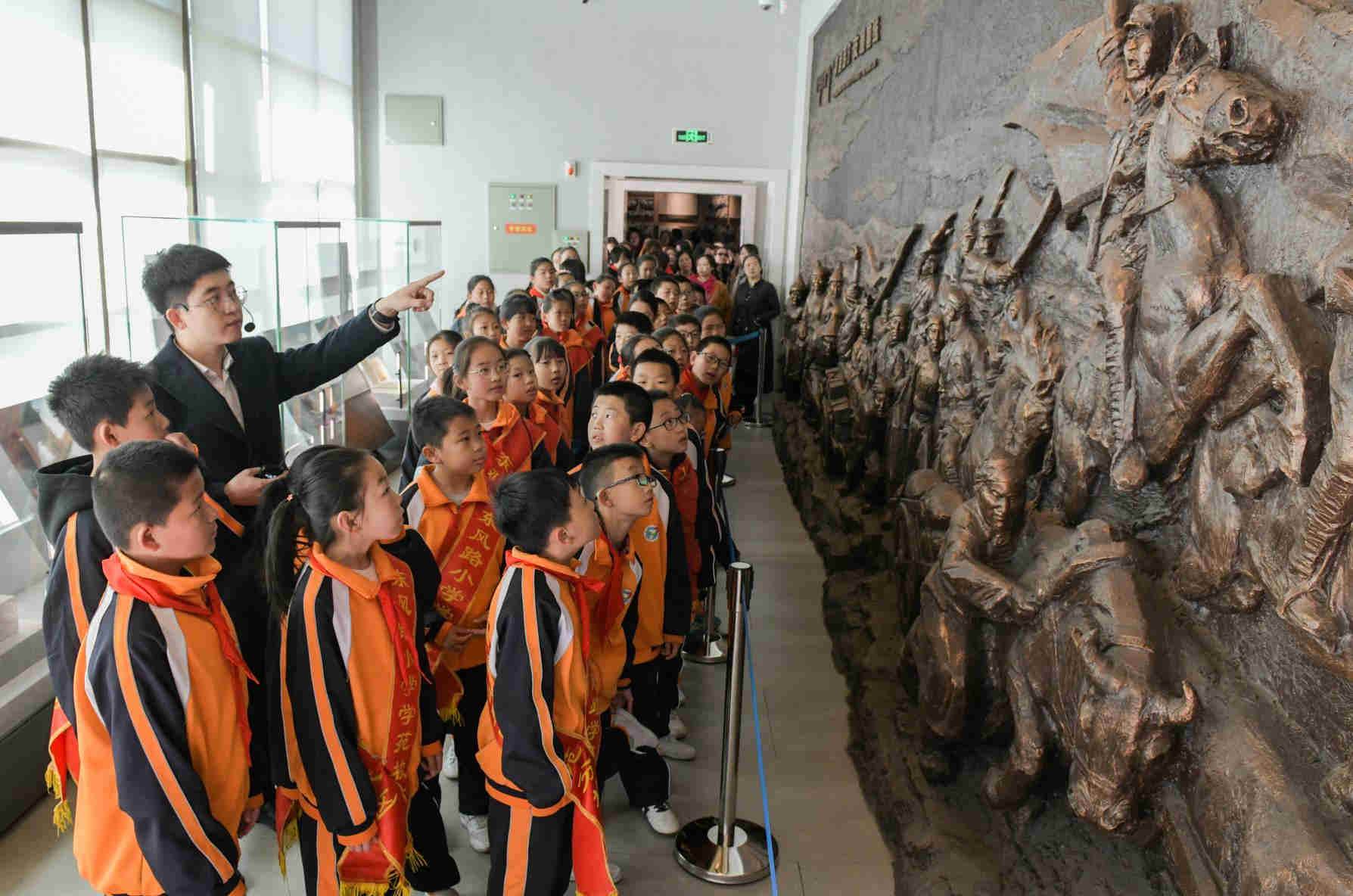 3月30日,講解員為小學(xué)生們講述革命故事。當(dāng)日,呼和浩特市賽罕區(qū)東風(fēng)路小學(xué)學(xué)苑校區(qū)在烏蘭夫紀(jì)念館開展了一場(chǎng)主題為“緬懷先烈告慰英雄做時(shí)代新人”的教育實(shí)踐活動(dòng)。孩子們?cè)隈雎牳锩适?、學(xué)習(xí)革命先烈光榮事跡中,接受了一次生動(dòng)的愛國(guó)主義教育。(內(nèi)蒙古日?qǐng)?bào)社融媒體記者 懷特烏勒斯攝)