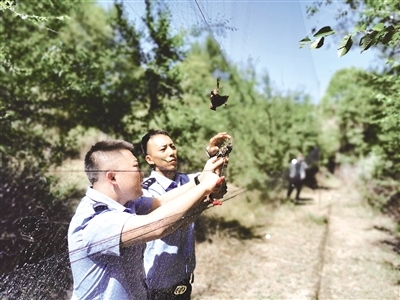 民警在周邊偵查,尚未發(fā)現(xiàn)可疑實(shí)施人員,民警及時(shí)對(duì)網(wǎng)上受困的野鳥(niǎo)進(jìn)行了解救和放飛,并對(duì)該處粘鳥(niǎo)網(wǎng)進(jìn)行了拆除、銷(xiāo)毀。