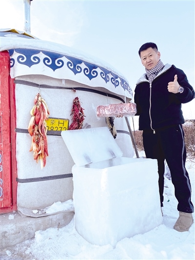 12月8日,記者幾經(jīng)周折與視頻中的小伙張智磊取得了聯(lián)系。張智磊今年36歲,從小在錫林郭勒大草原長大,在當?shù)刂饕雠Q蛉馍狻τ谝馔庾呒t,張智磊直言自己也沒有想到?!耙曨l是在錫林浩特市南郊向陽村叔叔家院子里的蒙古包拍攝的。記得小時候,每到冬天,周邊牧民都是把食物埋在雪地里儲存。我前幾天也拍了一個從雪地里找羊腿的視頻,有粉絲留言‘放在雪地里會不會忘記位置容易丟了’,然后我就突發(fā)奇想,干脆做個‘冰箱’把年貨放進去?!睆堉抢诟嬖V記者,他從12月3日開始凍冰塊,12月4日把凍結實的冰塊拿出來用冷水黏合,因為冰塊低于0攝氏度,遇水就會瞬間黏在一起,然后開始著手打磨,棱棱角角都用電熨斗熨平整,再加上蓋,一個“冰箱”就完成了。