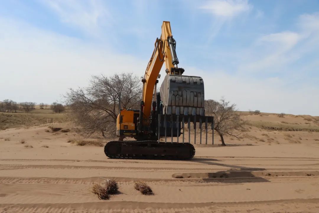 走進(jìn)白音錫勒牧場沃村吐儒分場,一派忙碌而有序的治沙景象映入眼簾。工人們手持工具,有條不紊地鋪設(shè)草方格,種植固沙植物。在眾多忙碌的身影中,一臺經(jīng)過創(chuàng)新改裝的鉤機(jī)格外引人注目,它正高效地進(jìn)行著沙障固沙作業(yè)。