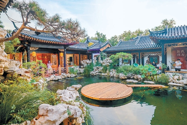 園中一泓池水,清澈如鏡,廊、軒、亭、榭環(huán)繞四周,夾岸有疊石、綠植、繁花,明朗清雅。后樓為展廳,中國當代水墨藝術家彭薇的作品《有故事的房間》正在展出,觀眾散落其間,駐足欣賞。
