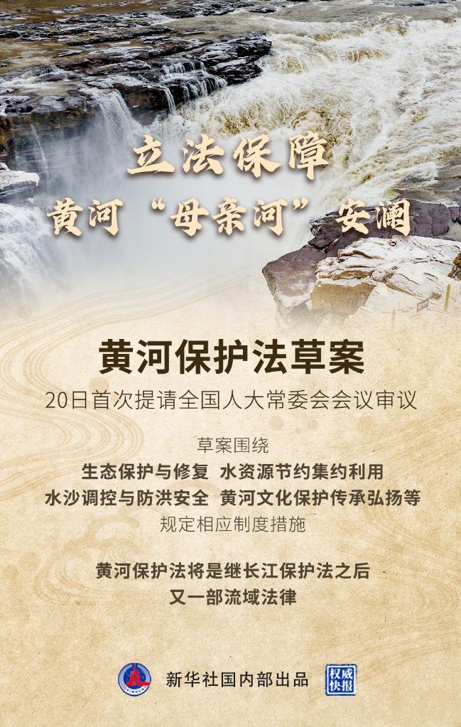 新華社北京12月20日電(記者劉詩平、王悅陽)黃河保護(hù)法草案20日首次提請十三屆全國人大常委會第三十二次會議審議。黃河保護(hù)法將是一部推動黃河流域生態(tài)保護(hù)和高質(zhì)量發(fā)展的法律,也將是繼長江保護(hù)法之后我國制定的又一部流域法律。