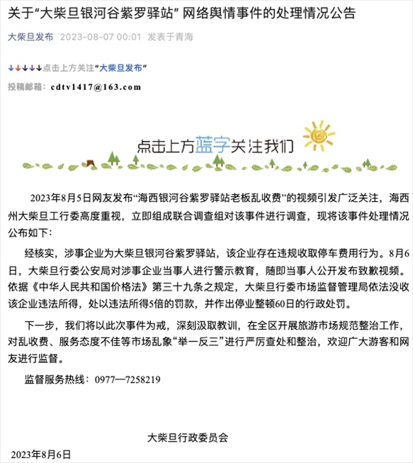 停車(chē)10分鐘 按人數(shù)收50元?青海大柴旦區(qū)再通報(bào):企業(yè)5倍罰款 停業(yè)60日 2023年8月5日網(wǎng)友發(fā)布“海西銀河谷紫羅驛站老板亂收費(fèi)”......