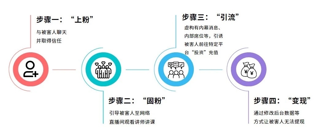 接下來,講師會通過虛構有內幕消息、內部席位等情節(jié),將被害人“引流”至團伙自制的“長盛資本”“瑞達資產(chǎn)”“匯利資產(chǎn)”等平臺“投資”充值,后把握時機,通過修改后臺數(shù)據(jù)等方式讓被害人無法提現(xiàn),卻成為他們的“變現(xiàn)”時刻。至案發(fā)時,該團伙已詐騙多名被害人,犯罪金額共計人民幣500余萬元。