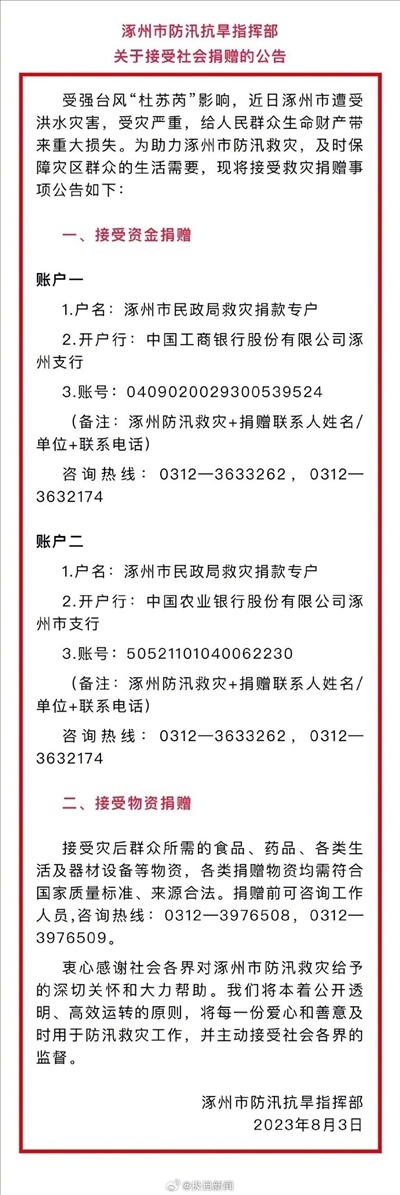 ·河北涿州接受社會(huì)捐贈(zèng),救災(zāi)捐款專(zhuān)戶公開(kāi)。