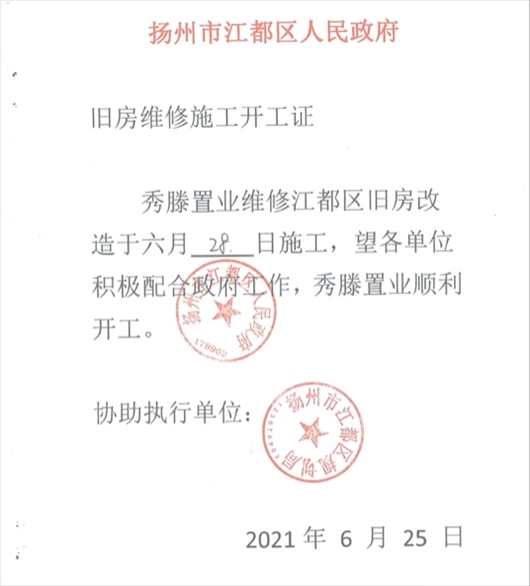 “搞定”西苑社區(qū)后,楊某軍偽造一份《揚(yáng)州市江都區(qū)人民政府舊房維修施工開工證》,并加蓋“揚(yáng)州市江都區(qū)人民政府 178962”“揚(yáng)州市江都區(qū)規(guī)劃局”公章。周女士獲得該證后,立即組織顧先生進(jìn)場施工?!皸钅耻娮屛蚁葔|付材料款和人工費(fèi),后面等財政撥款就行。我就安排顧先生7月1日進(jìn)場施工?!?/p>