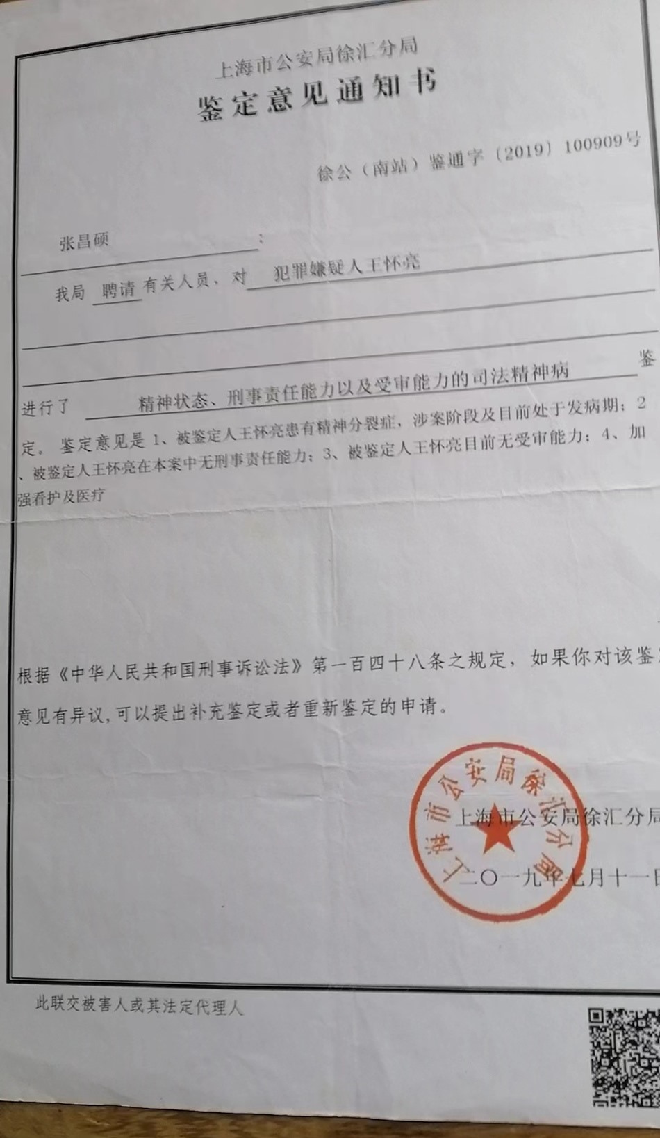 另一份是犯罪嫌疑人王懷亮的“精神狀態(tài)、刑事責(zé)任能力以及受審能力的司法精神病”鑒定書,寫道:王懷亮患有精神分裂癥,涉案階段及目前處于發(fā)病期;在本案中無刑事責(zé)任能力;目前無受審能力;加強(qiáng)看護(hù)及醫(yī)療。
