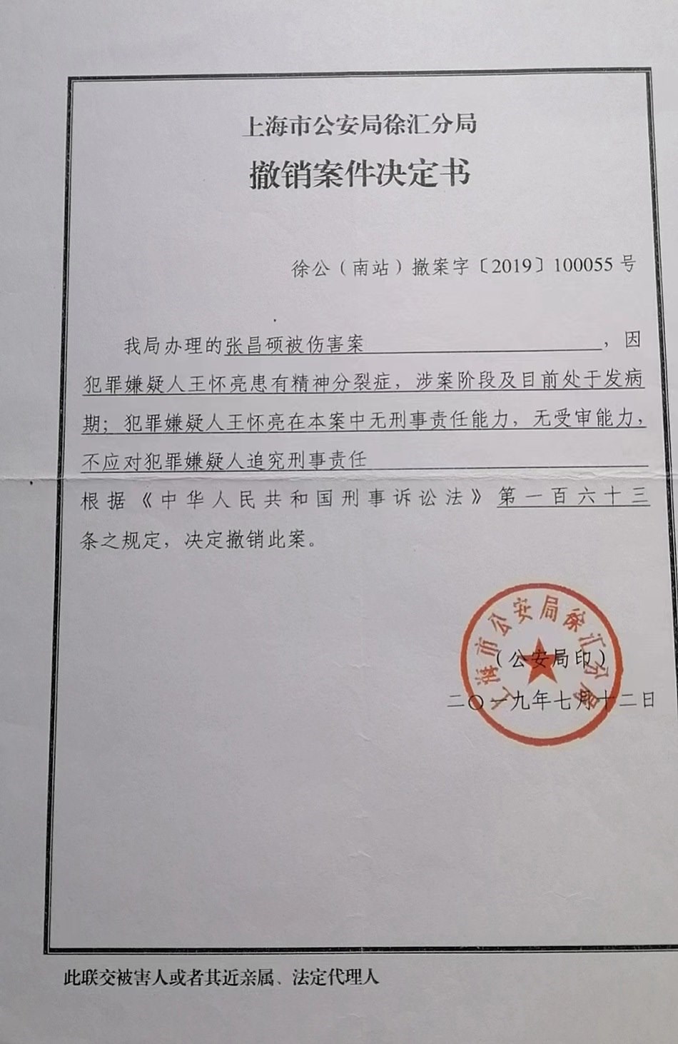 張宏銀回憶,他已經(jīng)不記得這起依法不負(fù)刑事責(zé)任的精神病人強(qiáng)制醫(yī)療程序案件開庭審理的具體時間,只記得是2019年下半年的一天上午,那天犯罪嫌疑人沒有到場,律師也沒有到場,檢察院的兩位人員出席了開庭。徐匯區(qū)法院當(dāng)庭做出判決:王懷亮被送往醫(yī)療機(jī)構(gòu)進(jìn)行強(qiáng)制醫(yī)療。2019年7月12日,張宏銀收到公安局的撤銷案件決定書。