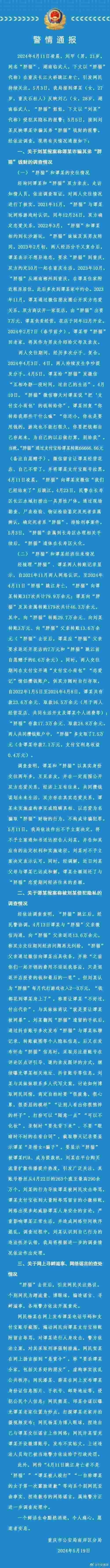 5月19日,重慶警方發(fā)布關(guān)于劉某(男,21歲,網(wǎng)名“胖貓”)在重慶長(zhǎng)江大橋跳江身亡事件相關(guān)情況的通報(bào)。通報(bào)詳情如下: