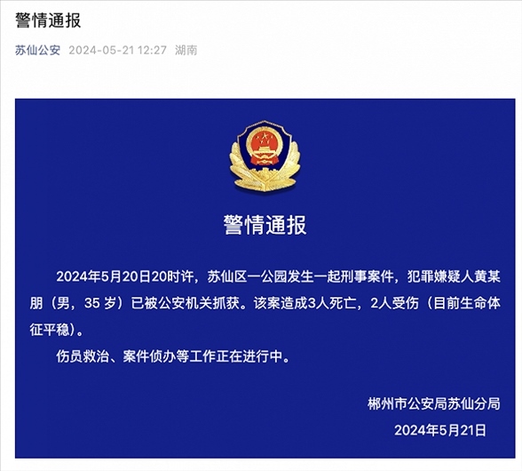 央視網(wǎng)消息:據(jù)蘇仙公安微信公眾號消息,5月20日20時許,蘇仙區(qū)一公園發(fā)生一起刑事案件,犯罪嫌疑人黃某朋(男,35歲)已被公安機關(guān)抓獲。該案造成3人死亡,2人受傷(目前生命體征平穩(wěn))。傷員救治、案件偵辦等工作正在進行中。