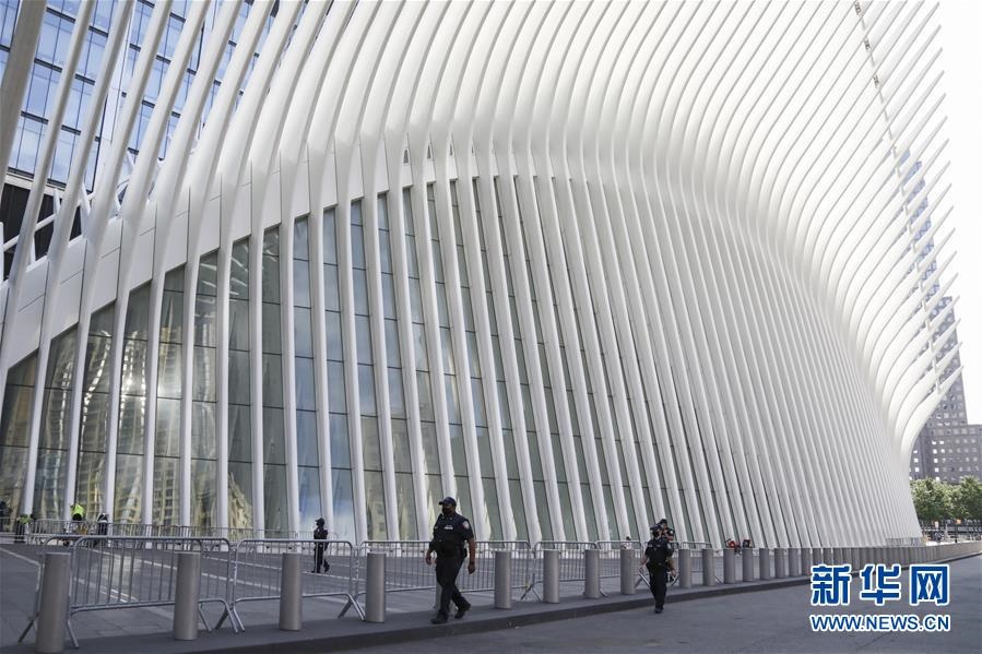 6月10日,警察在美國紐約世貿中心車站外戴著口罩巡邏。新華社記者王迎攝