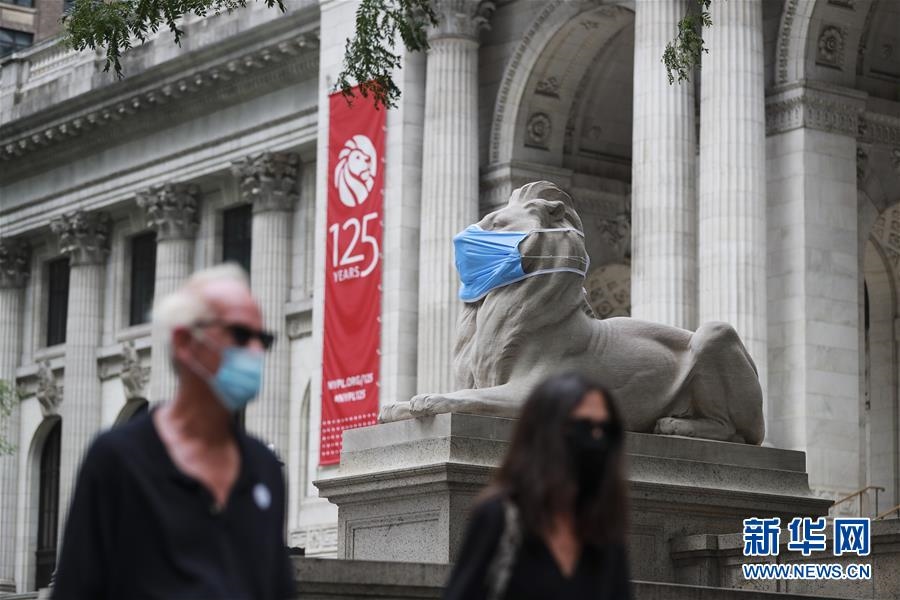 這是7月8日在美國(guó)紐約公共圖書(shū)館前拍攝的“戴”口罩的石獅子。新華社記者王迎攝