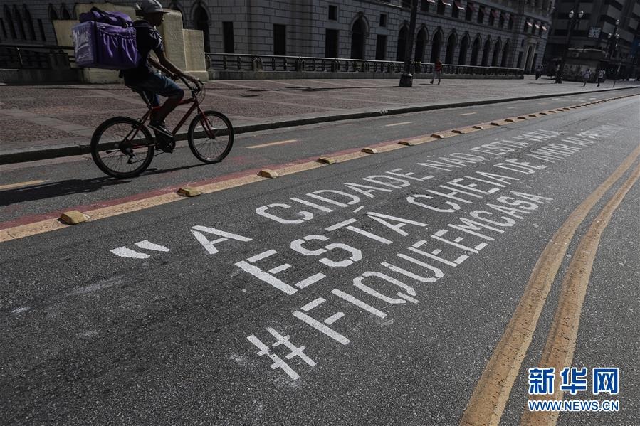 這是4月21日,巴西圣保羅市的一條道路上寫(xiě)有“城市不是空的,而是充滿(mǎn)著鄰里間的關(guān)愛(ài)#待在家中”字樣。新華社發(fā)(拉赫爾·帕特拉索攝)