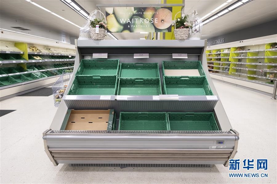 這是3月21日在英國(guó)倫敦拍攝的一家超市內(nèi)空空的貨架。新華社記者韓巖攝