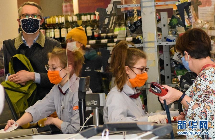 這是4月6日在德國(guó)耶拿一家超市拍攝的戴著口罩的收銀員和顧客。新華社發(fā)(凱文·福格特?cái)z)