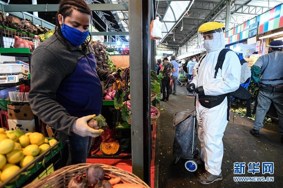 這是4月16日,身穿防護(hù)服的顧客在智利圣地亞哥拉貝加中心市場(chǎng)采購(gòu)。新華社發(fā)(豪爾赫·比列加斯攝)