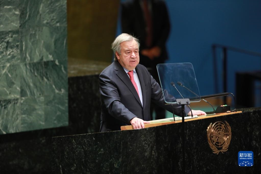 2月6日,在位于紐約的聯(lián)合國(guó)總部,聯(lián)合國(guó)秘書(shū)長(zhǎng)古特雷斯發(fā)表講話。新華社記者 謝鍔 攝