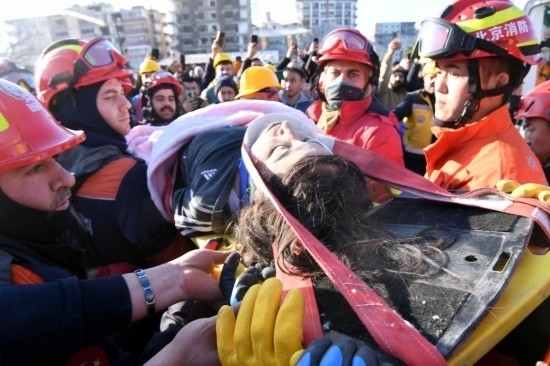 2月12日,在土耳其哈塔伊省安塔基亞市,中國救援隊轉(zhuǎn)移一名救出的幸存者。