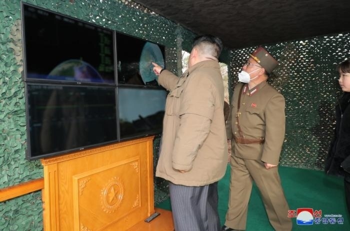 金正恩在試射現(xiàn)場觀察了發(fā)射前的準(zhǔn)備過程,了解了新型武器系統(tǒng)。