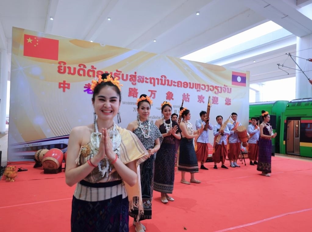 4月13日,在中老鐵路老撾萬象站,工作人員歡迎乘坐D887次國際旅客列車的旅客。新華社記者 邢廣利 攝