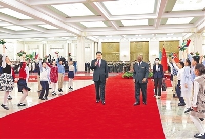 會談前,習(xí)近平在人民大會堂北大廳為邦戈舉行歡迎儀式。