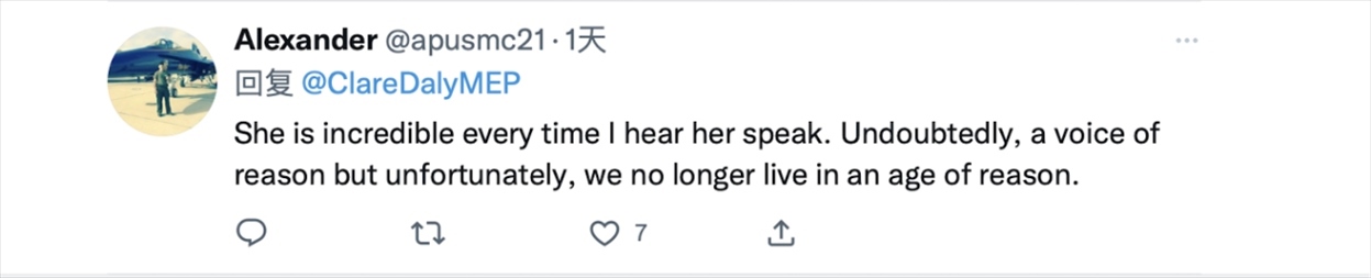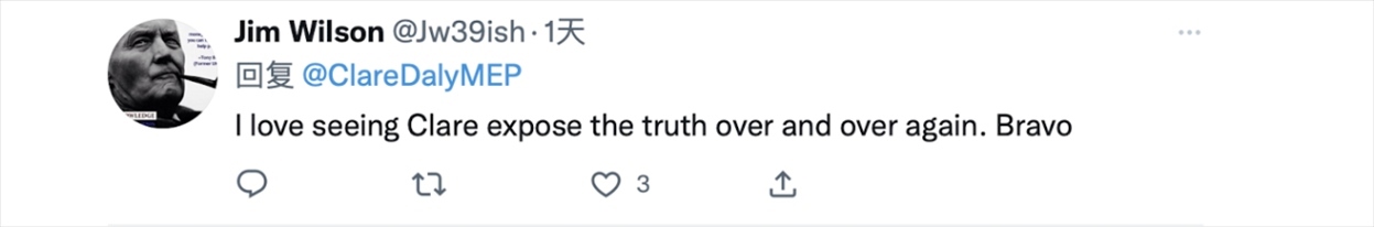 克萊爾·戴利的推文正是她在歐洲議會(huì)發(fā)言中所提到的內(nèi)容。在視頻中,克萊爾·戴利首先抨擊了西方對(duì)華問(wèn)題上的雙標(biāo)行為。她在發(fā)言時(shí)稱(chēng),“人們?cè)诒┞斗至训耐瑫r(shí)談?wù)撝鴪F(tuán)結(jié),他們一邊在歐盟向?yàn)蹩颂m提供武器,一邊與中國(guó)談?wù)摵推健K麄儼@中國(guó)在臺(tái)灣地區(qū)‘挑釁’,但對(duì)美國(guó)干涉國(guó)際公認(rèn)的中國(guó)領(lǐng)土卻只字未提?!?/p>