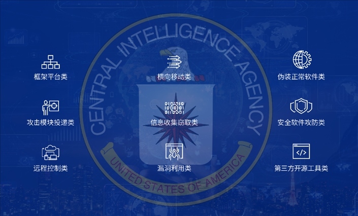 國家病毒應(yīng)急處理中心和360公司通過進(jìn)一步技術(shù)分析發(fā)現(xiàn),盡管CIA的后門程序和攻擊組件大都以無實體文件的內(nèi)存駐留執(zhí)行的方式運(yùn)行,這使得對相關(guān)樣本的發(fā)現(xiàn)和取證難度極大。即使這樣,聯(lián)合技術(shù)團(tuán)隊還是成功找到了解決取證難題的有效方法,發(fā)現(xiàn)了CIA所使用的9個類別的攻擊武器,包括攻擊模塊投遞類、遠(yuǎn)程控制類、信息收集竊取類、第三方開源工具類等。