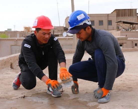 在烏茲別克斯坦希瓦古城哈?!つ吕聨焓矂e吉清真寺,中方文物修復(fù)人員指導(dǎo)烏方工作人員修復(fù)清真寺屋頂。