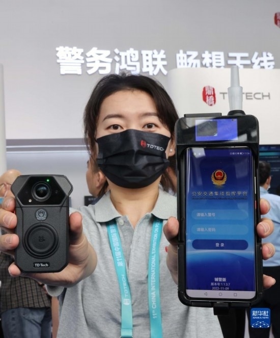 5月12日,工作人員在展示交警多功能移動警務終端(右)和5G執(zhí)法記錄儀。