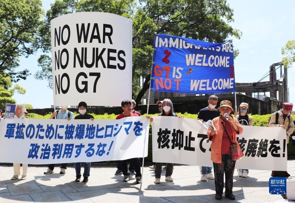 “不做戰(zhàn)爭幫兇”“不要G7”……14日,200多名日本民眾舉著各式標(biāo)語,在廣島和平紀(jì)念公園原子彈轟炸遺址舉行集會(huì),強(qiáng)烈抗議七國集團(tuán)(G7)峰會(huì)將在廣島召開。