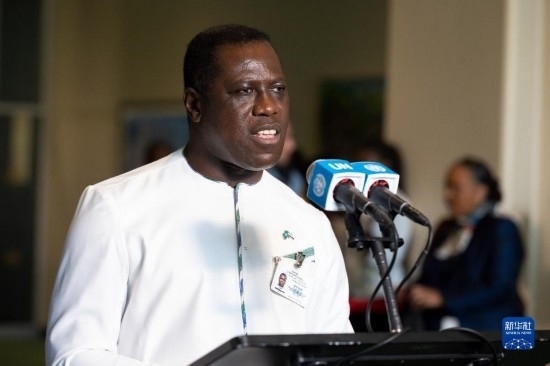 6月6日,在位于紐約的聯(lián)合國總部,塞拉利昂外交與國際合作部長弗朗西斯在塞拉利昂當(dāng)選聯(lián)合國安理會(huì)非常任理事國后在記者見面會(huì)上講話。新華社發(fā)(聯(lián)合國供圖/洛伊·費(fèi)利佩攝)