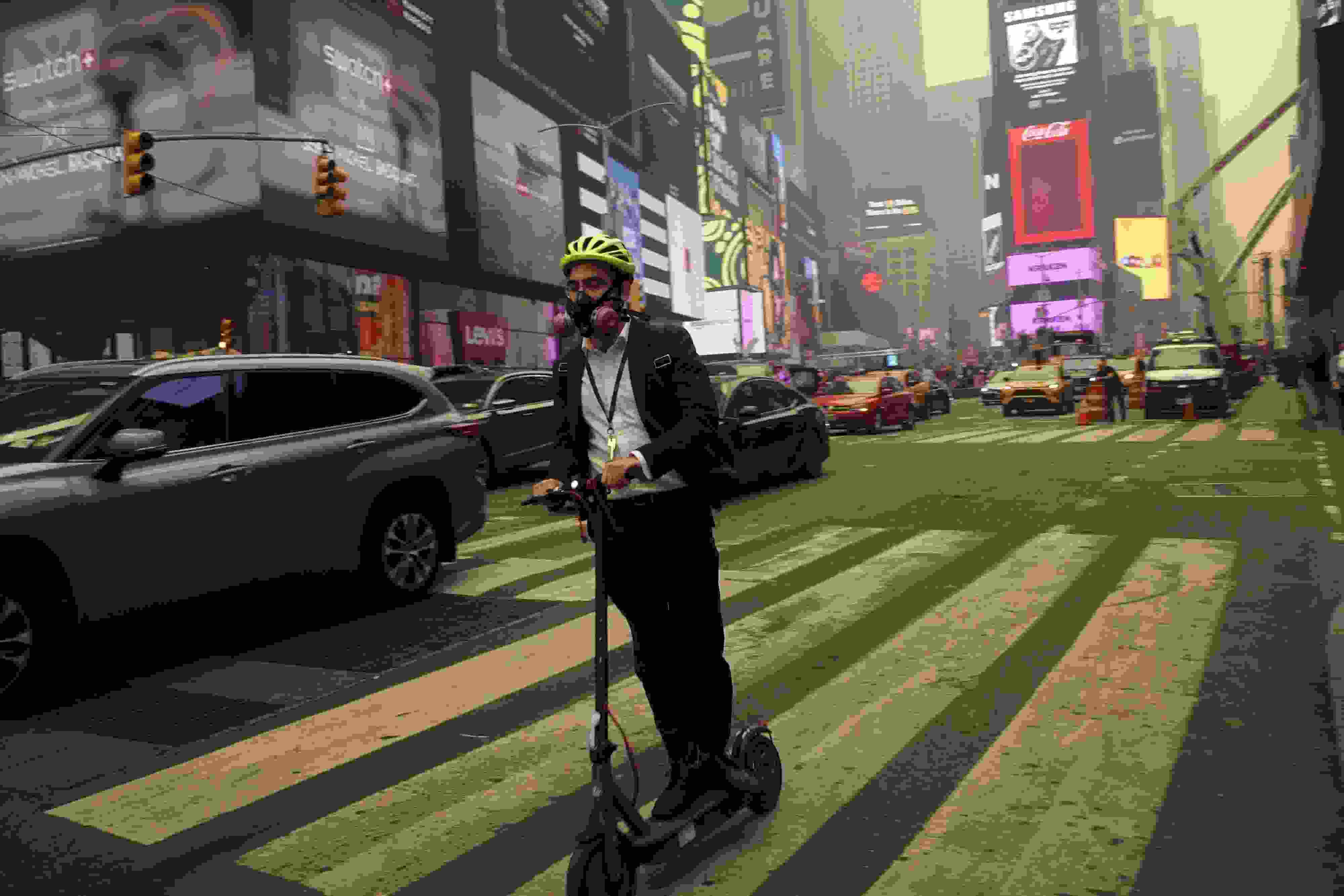 當(dāng)?shù)貢r(shí)間6月7日,美國(guó)紐約時(shí)報(bào)廣場(chǎng)的一位騎行者佩戴著呼吸過(guò)濾器。近日,加拿大野火產(chǎn)生的煙霧蔓延至美國(guó),紐約市出現(xiàn)霧霾,戶(hù)外民眾嚴(yán)密防護(hù)。 視覺(jué)中國(guó)