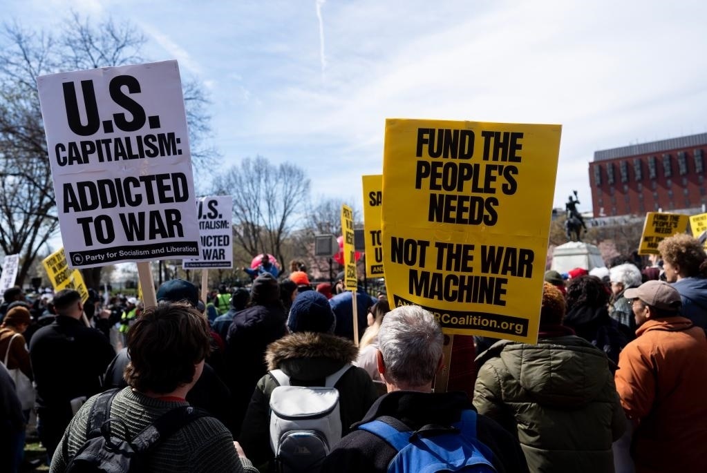 3月18日,在美國首都華盛頓,反戰(zhàn)人士在白宮前參加集會(huì)。新華社記者 劉杰 攝