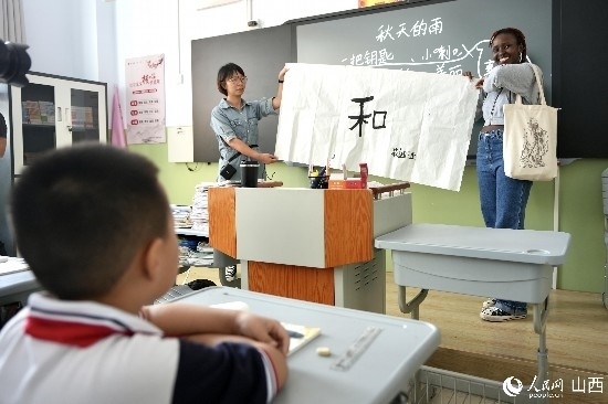 圖為莉迪亞給午亭小學(xué)三年級(jí)一班的同學(xué)贈(zèng)送書(shū)法禮物。人民網(wǎng) 盧鵬宇攝