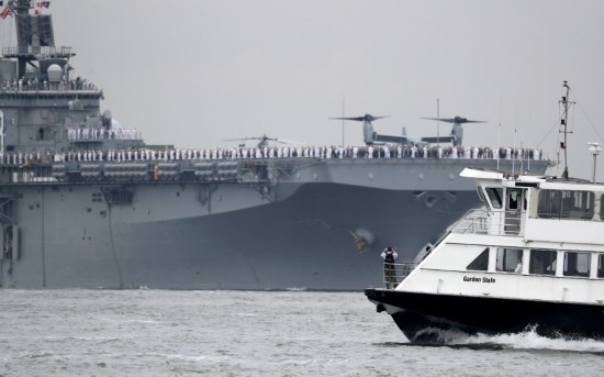 2017年5月24日,在美國(guó)紐約,美國(guó)海軍“基薩奇”號(hào)兩棲攻擊艦參加紐約艦隊(duì)周艦船巡游活動(dòng)。新華社記者王迎攝