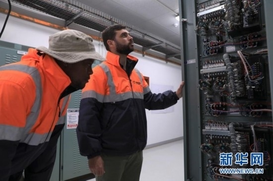 8月10日,在南非北開普省德阿鎮(zhèn),當(dāng)?shù)鼐用?、變電站工作人員達(dá)斯溫·巴松(左)與變電站副主管雷加特·范滕德在龍源南非公司德阿風(fēng)電項目變電站工作。新華社記者 董江輝 攝