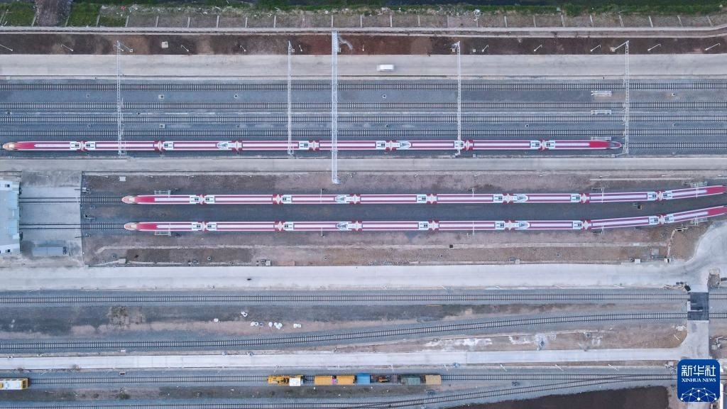 7月20日,雅萬高鐵列車停靠在印度尼西亞萬隆德卡魯爾動車所附近(無人機照片)。新華社記者 徐欽 攝