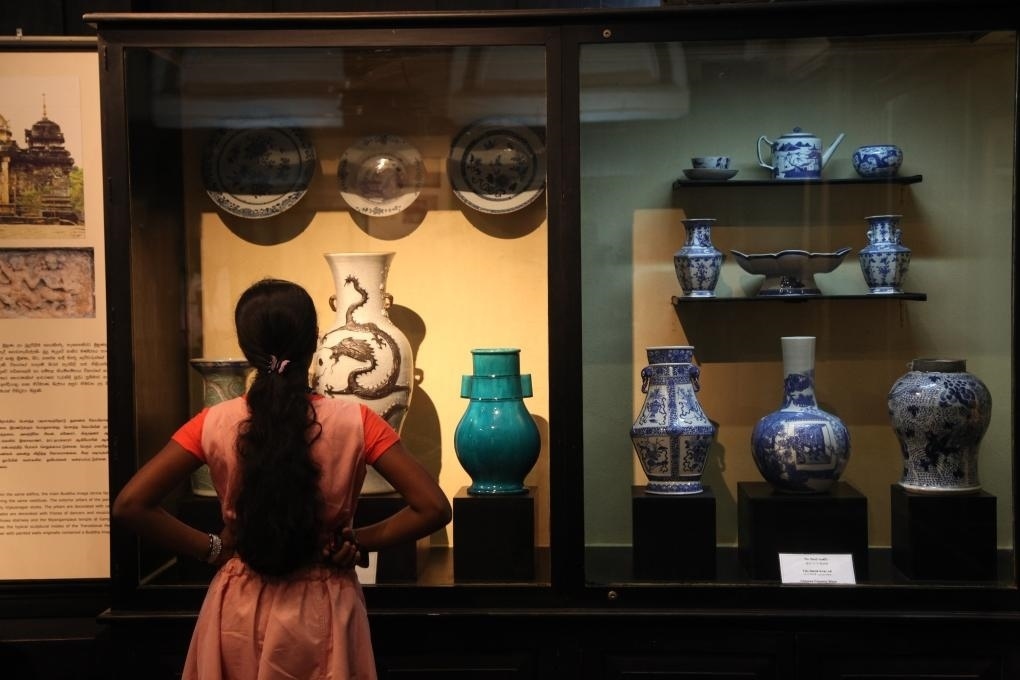 2014年9月15日,在斯里蘭卡首都科倫坡,游客參觀斯里蘭卡國(guó)家博物館展出的當(dāng)?shù)爻鐾恋闹袊?guó)古代瓷器,一些中國(guó)外銷瓷器上還繪有南亞、伊斯蘭風(fēng)情,與鄭和碑共同見(jiàn)證著古代海上絲綢之路和中斯友好交往的源遠(yuǎn)流長(zhǎng)。 新華社記者馮武勇攝