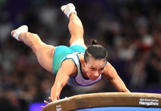 9月28日,烏茲別克斯坦選手奧克薩娜·丘索維金娜在杭州亞運(yùn)會競技體操項(xiàng)目女子跳馬決賽中,最終她獲得第四名。新華社記者 程敏 攝