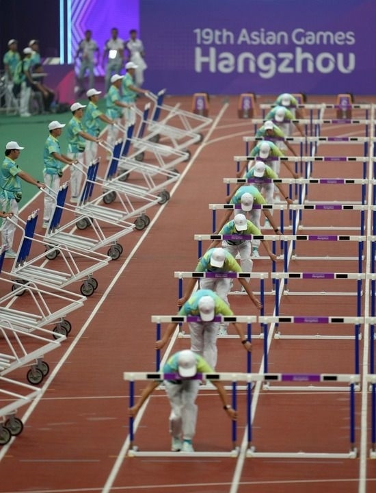 9月30日,杭州亞運(yùn)會志愿者在田徑項(xiàng)目女子七項(xiàng)全能100米欄比賽前進(jìn)行場地準(zhǔn)備工作。新華社記者 江文耀 攝
