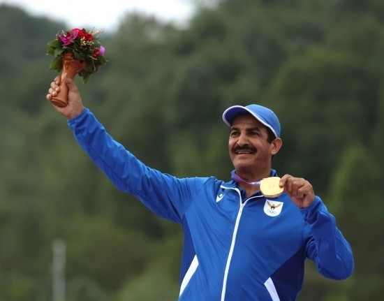 9月27日,金牌得主科威特選手阿卜杜拉·拉希迪在杭州亞運(yùn)會射擊項(xiàng)目男子雙向飛碟個人賽頒獎儀式上。新華社記者 杜瀟逸 攝