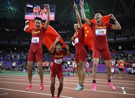 10月3日,中國選手陳冠鋒、謝震業(yè)、陳佳鵬、嚴(yán)海濱(從右至左)慶祝奪得杭州亞運(yùn)會田徑項(xiàng)目男子4x100米接力冠軍。新華社記者 宋彥樺 攝