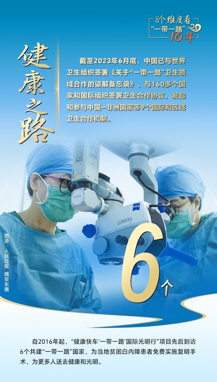 截至2023年6月底,中國已與世界衛(wèi)生組織簽署《關于“一帶一路”衛(wèi)生領域合作的諒解備忘錄》,與160多個國家和國際組織簽署衛(wèi)生合作協(xié)議,發(fā)起和參與中國—非洲國家、中國—阿拉伯國家、中國—東盟衛(wèi)生合作等9個國際和區(qū)域衛(wèi)生合作機制。為共建國家培養(yǎng)數(shù)萬名衛(wèi)生管理、公共衛(wèi)生、醫(yī)學科研等專業(yè)人才,向58個國家派出中國醫(yī)療隊,赴30多個國家開展“光明行”,免費治療白內障患者近萬名,與湄公河流域國家、中亞國家、蒙古國等周邊國家開展跨境醫(yī)療合作,衛(wèi)生健康合作成效顯著。