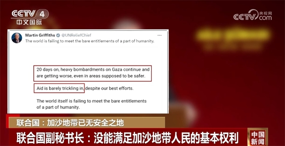 同一天,聯(lián)合國(guó)分管人道主義事務(wù)的副秘書長(zhǎng)馬丁·格里菲斯在社交媒體發(fā)文稱,在過(guò)去20天里,對(duì)加沙地帶的猛烈轟炸愈發(fā)嚴(yán)重,一些本該安全的地區(qū)也已經(jīng)陷入危險(xiǎn),但援助物資卻很難進(jìn)入加沙地帶,國(guó)際社會(huì)沒(méi)能滿足一部分人的基本權(quán)利。
