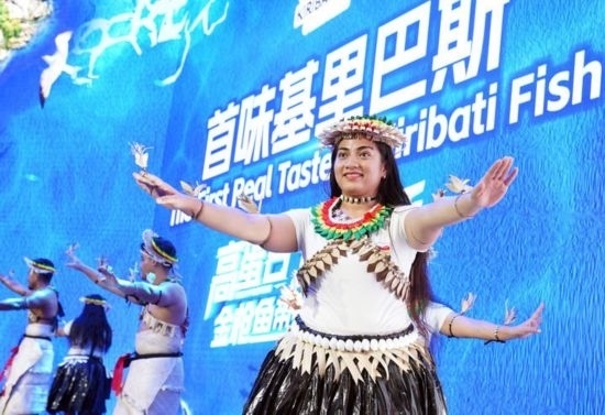 11月8日,來自基里巴斯的參展人員在基里巴斯水產品推介活動上表演。